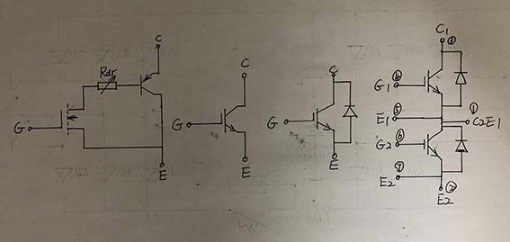 以上說到對端子電阻的測量只是大致判定IGBT的好壞,尚不能最后認(rèn)定IGBT就是好的,簡易測量后,就對客戶說,輸出模塊是好的,會給自己帶來極大的被動,IGBT的好壞還需進(jìn)一步測量驗證。如何檢測IGBT的好壞,得首先從IGBT的結(jié)構(gòu)原理入手,找到相應(yīng)有效的測量方法,如圖所以為IGBT等效電路和單、雙管模塊引腳圖。