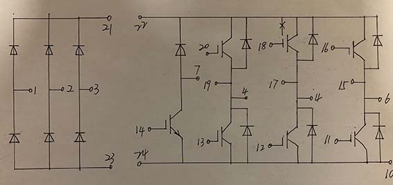 需要說明的是,橋式整流電路用的是低頻整流二極管模塊,正向壓降和正向電阻較大,同于一般硅整流二極管。而IGBT上反向并聯(lián)的6只二極管是調(diào)整二極管,正向壓降和正向電阻較小,正向壓降為0.35V左右,指針式萬用表測量正向電阻為4KR左右。